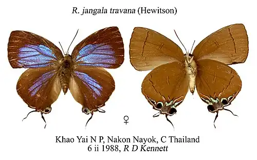 - Remelana jangala travana (Hewitson); Pinratana, 1981: 137; Eliot, 1992: 318, 424, pl. 49, figs 11-13.