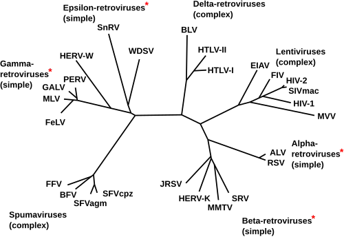 Genera (overview): Alpharetrovirus – Betaretrovirus – Deltaretrovirus – Epsilonretrovirus – Gammaretrovirus – Lentivirus – Simiispumavirus