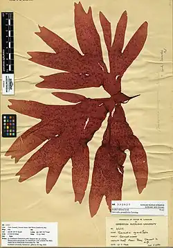- Rodriguez-Prieto, C., Lin, S.-M., Nelson, W.A. & Hommersand, M.H. 2011. Developmental morphology of Sarcodia montagneana and S. grandifolia from New Zealand and a phylogeny of Sarcodia (Sarcodiaceae, Rhodophyta) based on rbcL sequence analysis. European Journal of Phycology 46(2): 153–170. DOI: 10.1080/09670262.2011.580198 Reference page.