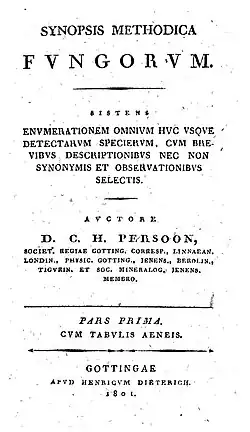 - Persoon, C.H. 1801. Synopsis methodica fungorum. Göttingen, 240 pages. BHL Reference page.