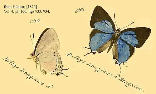 - Bithys longinus (Fabricius); Hübner, [1826], Vol. 4: pl. 160, figs 933, 934.