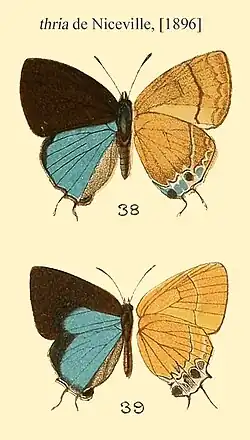 - Tajuria thria de Nicéville, 1896: 181, pl. T, figs 38-39.