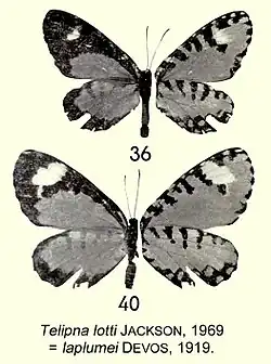 - Jackson, T.H.E. 1969. A revision of the genus Telipna Aurivillius (Lepidoptera: Lycaenidae). Bulletin of the British Museum (Natural History), Entomology 23: 1–23, 5 pls. BHL text, plates. Reference page.