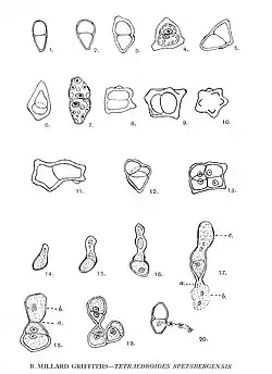 - Griffiths, B.M. 1923. Tetraedroides spetsbergensis gen. et sp. nov., a new alga from Spitzbergen (Results of the Oxford University Expedition to Spitzbergen, No. 28). New Phytologist 22(2): 69–71, pl. II: figs 1–20. BHL Reference page. : 71, figs 1-20