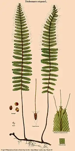 - Lectotype species (conserved): Trichomanes crispum L., Sp. Pl. 2: 1097 (1753), designated by Underwood, Mem. Torrey Bot. Club 6: 256, 283 (1899); accepted by Pichi Sermolli, Webbia 28: 446 (1973) and by Jarvis et al.. Regnum Veg. 127: 95 (1994)..