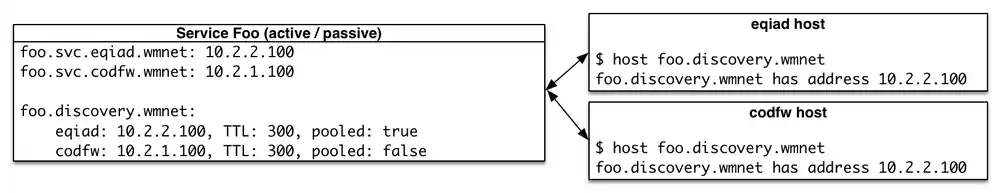 For example, with both data centers pooled, an host in eqiad that will resolve service-name.discovery.wmnet will get the IP of service-name.svc.eqiad.wmnet while an host in codfw will get the IP of service-name.svc.codfw.wmnet.
