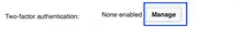 - Then click on Manage, listed under the Two Factor-authentication option.