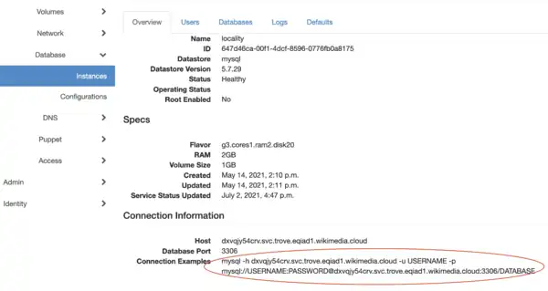 Horizon provides an example shell command and an example URI as shortcuts for database access. To view these examples, click an Instance name and go to the "Connection Information" section on the Overview tab.