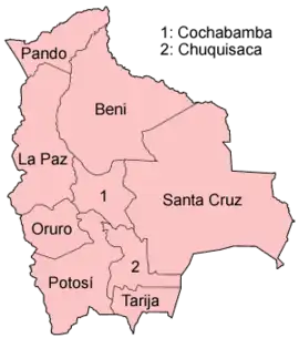 - Tarija (180.000 locuitori), în sud la granița cu Argentina , ce mai europenizat oraș al Boliviei, așezat la altitudinea de 1.900 m.
