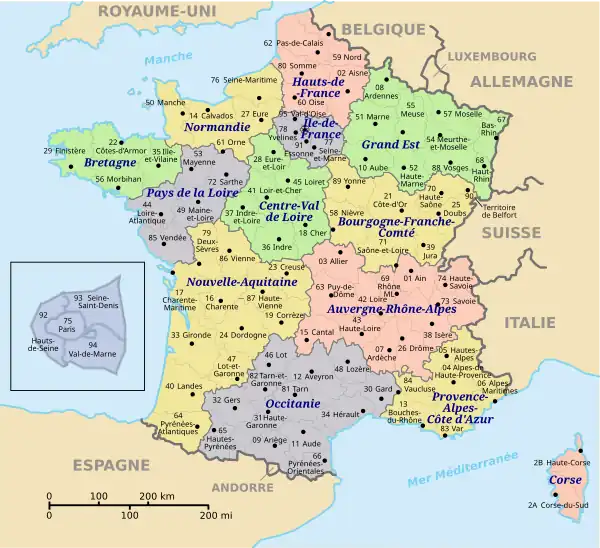 Franța este împărțităîn 13 de regiuni administrative în Europa și 4 regiuni-departamente peste mări: