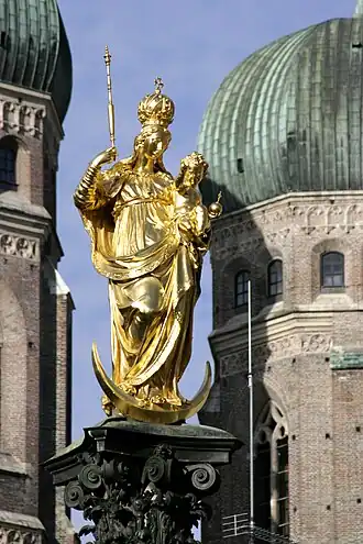 Monumentul Fecioarei Maria, cu cele două turnuri ale Catedralei din München în planul secund