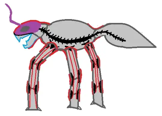 Next a crude scheme with something like a giant generic insect, about how this could look, practically an internal rigid support shown in black which could be considered a spine or column as internal muscle anchor point, the column would be directly conected with the "braincase" and specific parts of the body in which some muscle and skin is over the exoekeleton together with the internal muscles to improve the strenght.