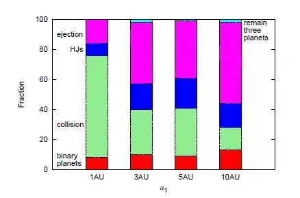The authors carried out simulations of three gas giant planets orbiting a star (some simulations involved two, while others had the third play a minor role), and found different results for different values of the inner planet’s semi-major axis: