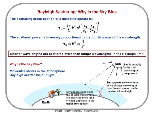 That is, some frequencies of the light from the sun will be scattered by the atmosphere and the atmosphere will appear to be that color. The sun will appear to be a blend of the colors that are not scattered out.