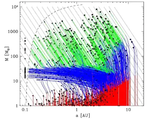 which describes the number of bodies of mass $m_k=km_1$, which are formed when bodies of masses $m_i$ and $m_j$ merge at rate $A_{ij}$. However, only a few analytical solutions exist for various $A_{ij}$. Note that using this requires setting $n_1$ at $t=0$, which requires a lot of guesswork. Migration and orbital issues will have to be dealt with later. However, it’s still an interesting tool.