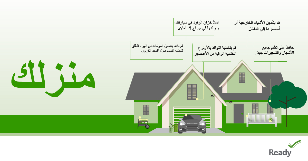 جهيز منزلك  قم دائمًا بتشغيل المولدات في الهواء الطلق لتجنب التسمم بأول أكسيد الكربون.  املأ خزان الوقود في سيارتك، واركنها في جراچ إذا أمكن.  قم بتغطية النوافذ بالأولواح الخشبية الواقية من الأعاصير.  قم بتأمين الأشياء الخارجية أو أحضرها إلى الداخل.   حافظ على تقليم جميع الأشجار والشجيرات جيدًا.