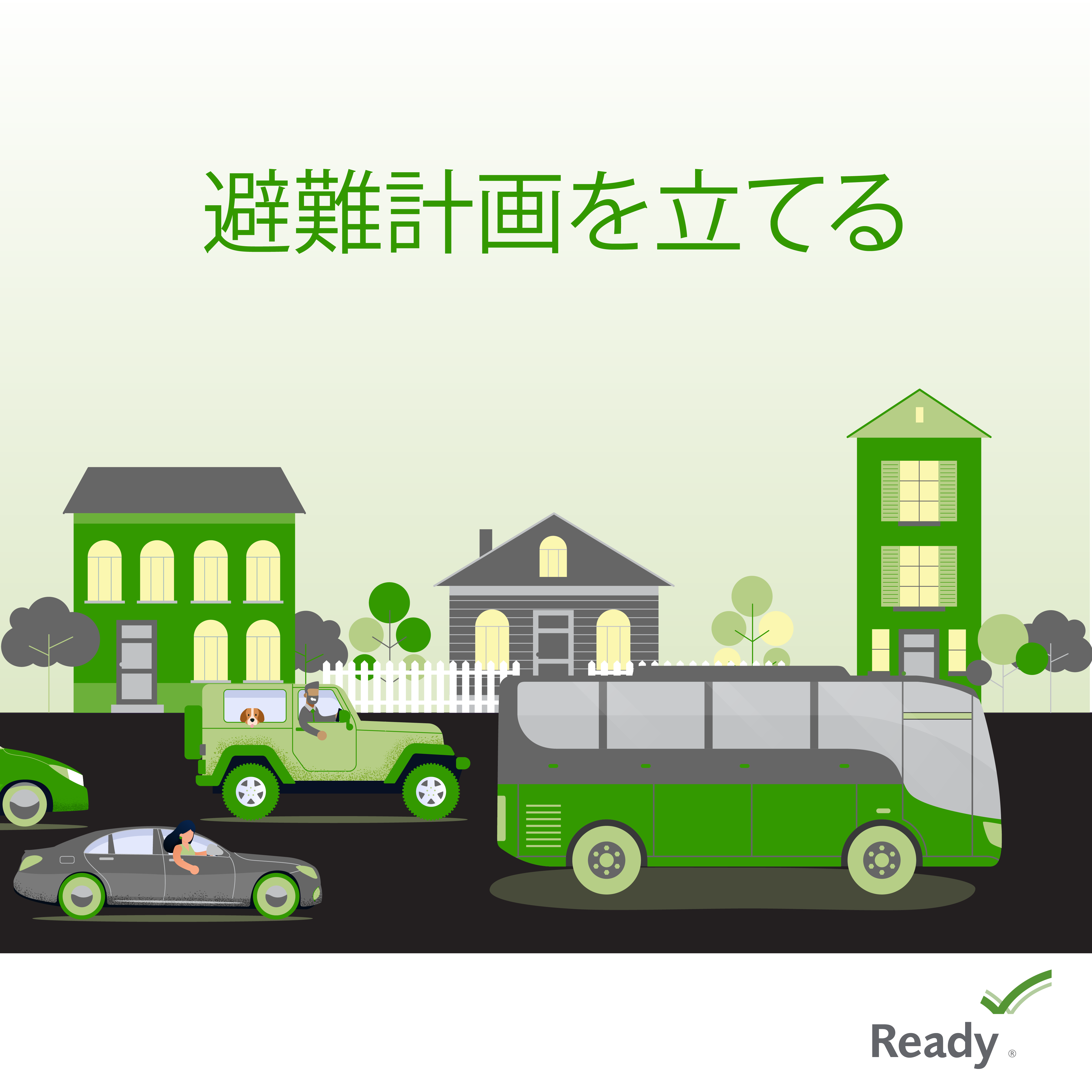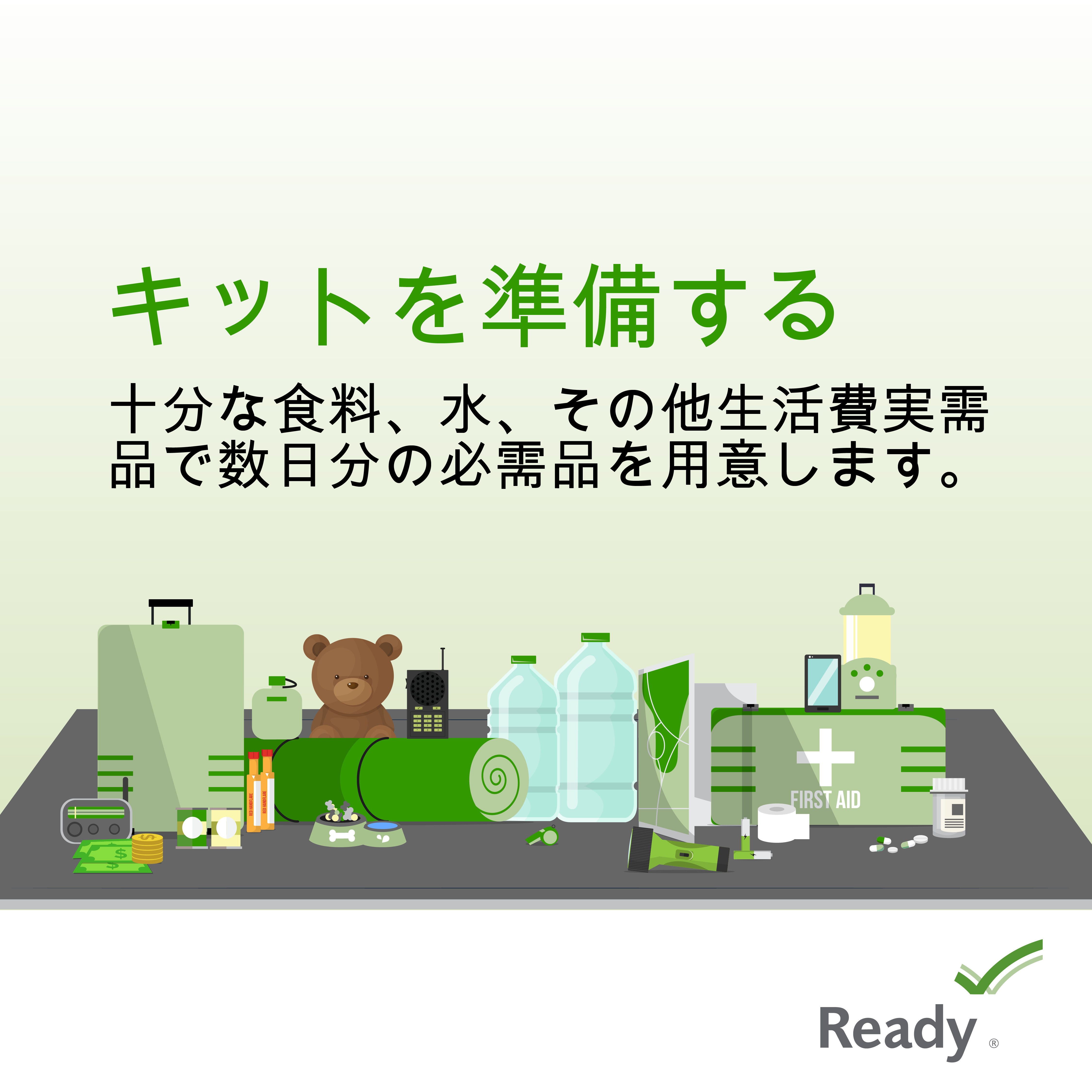 今こそ備えを致しましょう。 家族、ペット、介助動物のための必需品も併せて準備ましょう。 備品には以下が含まれます- 食料と水、お薬、懐中電灯、充電器、身分証明書、保険証。