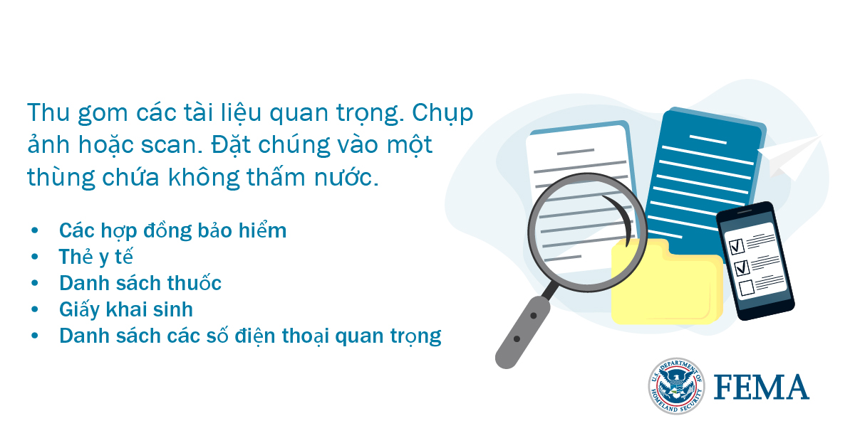Thu thập các tài liệu quan trọng. Chụp ảnh hoặc scan. Đặt những tài liệu này vào thùng đựng không thấm nước. Thu thập các hợp đồng bảo hiểm, thẻ y tế, danh sách thuốc, giấy khai sinh, danh sách các số điện thoại quan trọng.