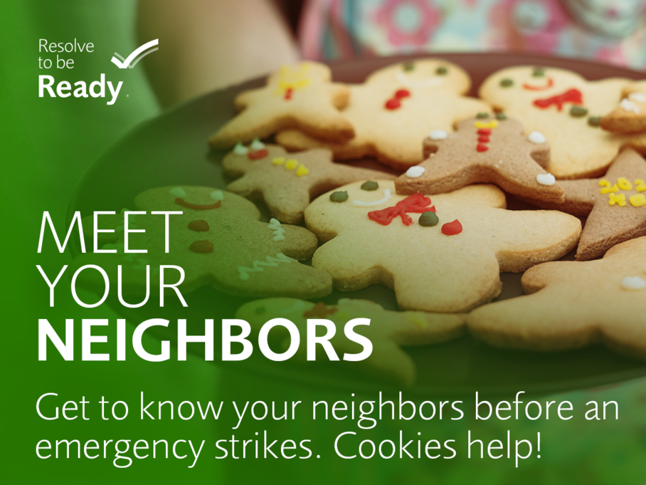 A woman holding a plate of fresh baked cookies. Text reads: Meet your neighbors. Get to know your neighbors before an emergency strikes. Cookies help!